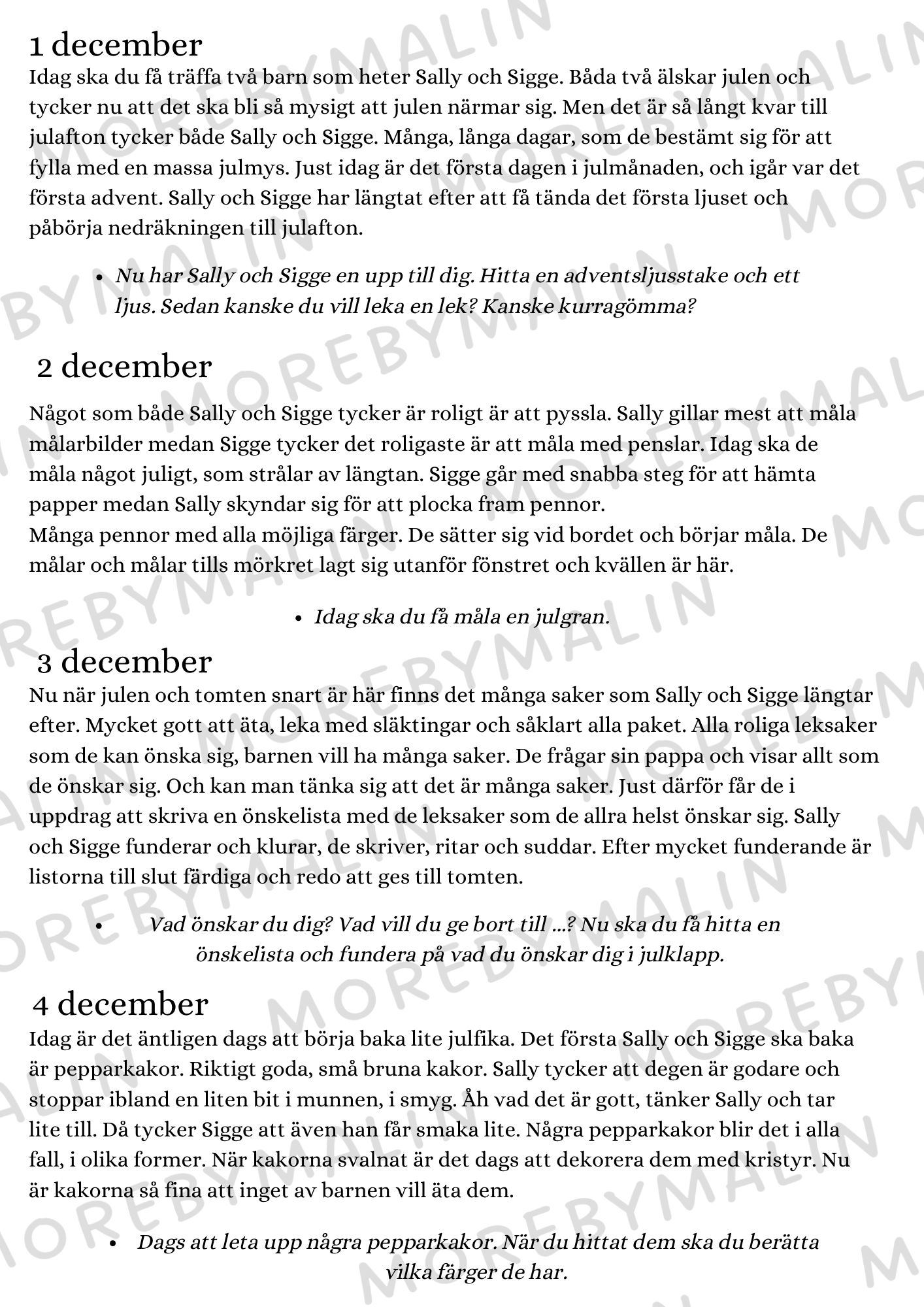 Det gör Sally och Sigge också! I år har de gjort en plan, att varje dag i december fram till julafton göra något julmysigt! Häng med i allt de hittar på och få egna, lätta uppdrag att göra själv.